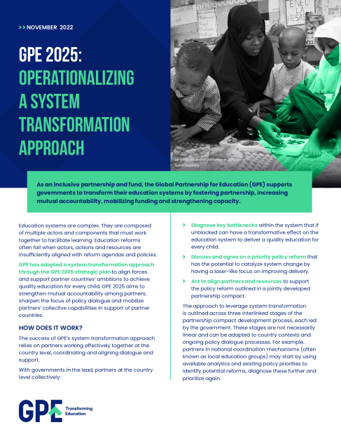 GPE has adopted a system transformation approach through the GPE 2025 strategic plan to align forces and support partner countries’ ambitions to achieve quality education for every child.